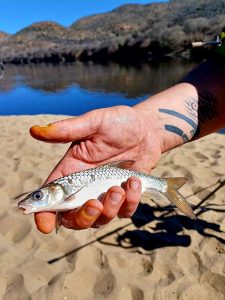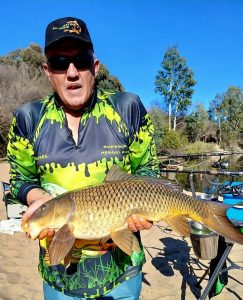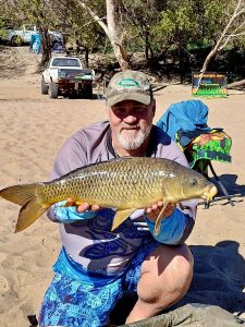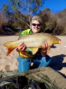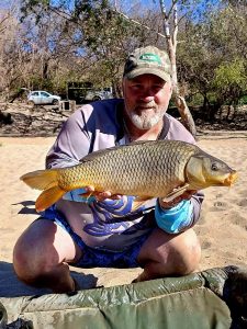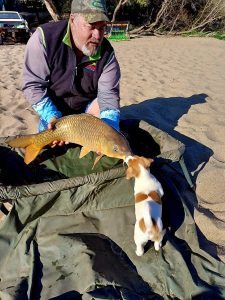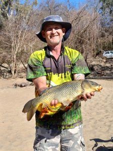 Nou is die ys gebreuk en ons weet die vis gaan aan die gang kom. Dis ’n baie lekke oggend en is beslis nie so koud soos die vorige sessie nie. Ek herlaai my stok 1 weer met dieselfde kombinasie maar ek haal net die pit a fen sit ’n Bunspice float in sy plek… so na 1uur 30min loop my regter stok en ek begin my vis speel sodat ons hom op die wal kan kry. Vat dit maar stadig maar ek land my karp van 6kg. So laai ek weer die stok met dieselfde kombinasie en weer gooi ek in die stroom.