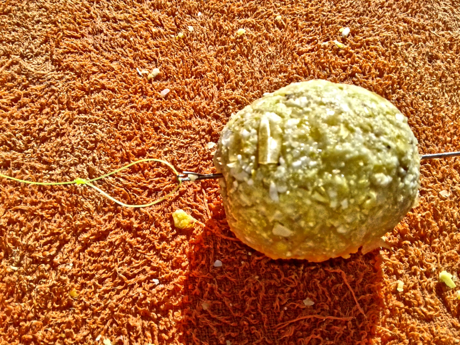 Druk jou boilie naald deur die gat in die middel van die voerbal sodat die hak gedeelte buite die bom is.
